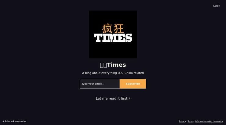 This is 疯狂Times, a newsletter started by two post-graduate students about U.S.-China Relations. Sent Weekly. Check out similar newsletters like Daily Skimm and 1440 Daily Digest.